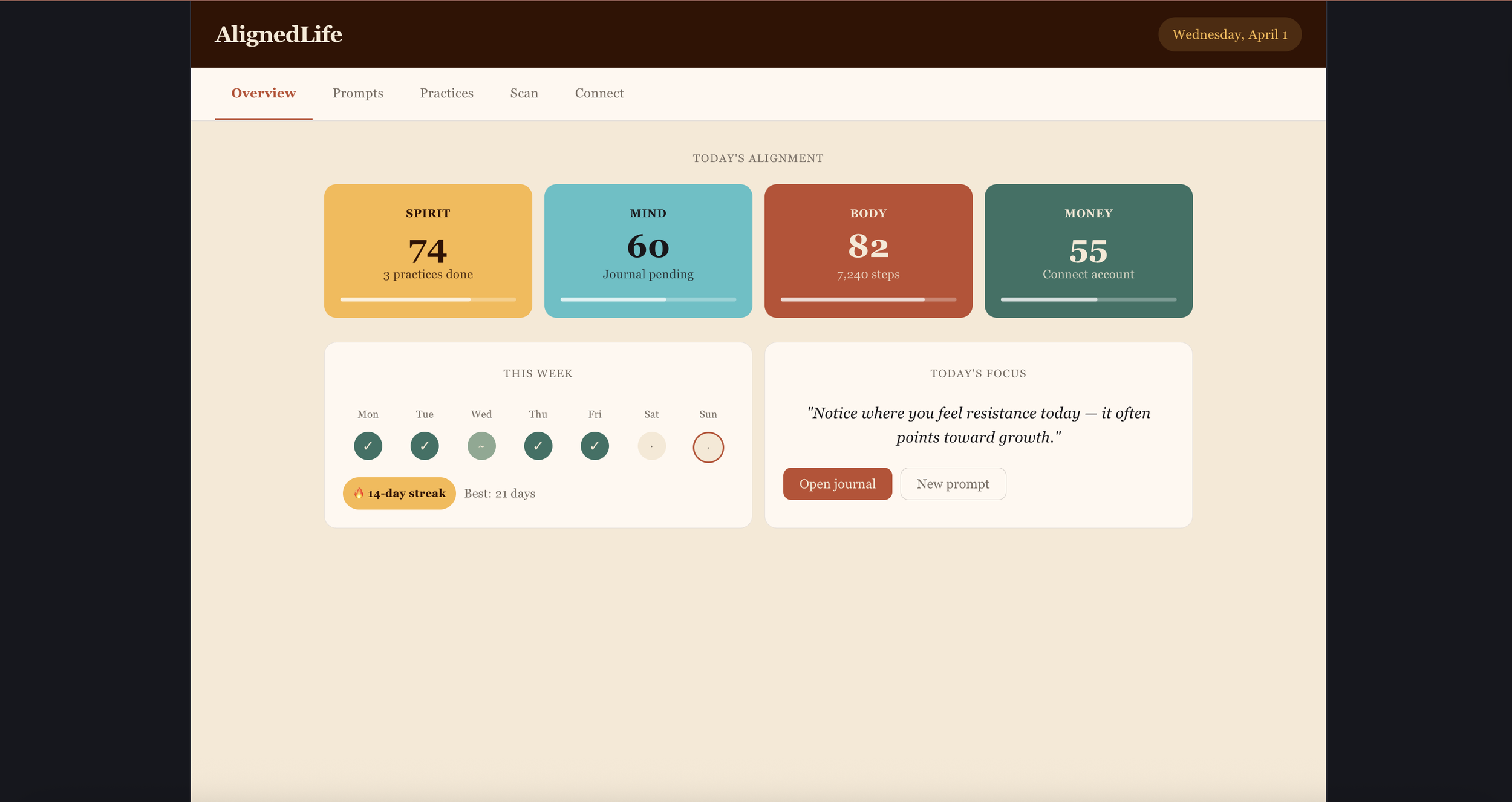 There's never been a better time to be a dreamer. Yesterday, I spent the day in a one-day mastermind with other financial advisors to build something from scratch using AI, specifically Claude. I brought the idea of a dashboard, eventually an app, that helps people monitor the alignment of their spirit, mind, body, and money. This dashboard only existed in my mind and some notes I had written down with features I wanted to see: